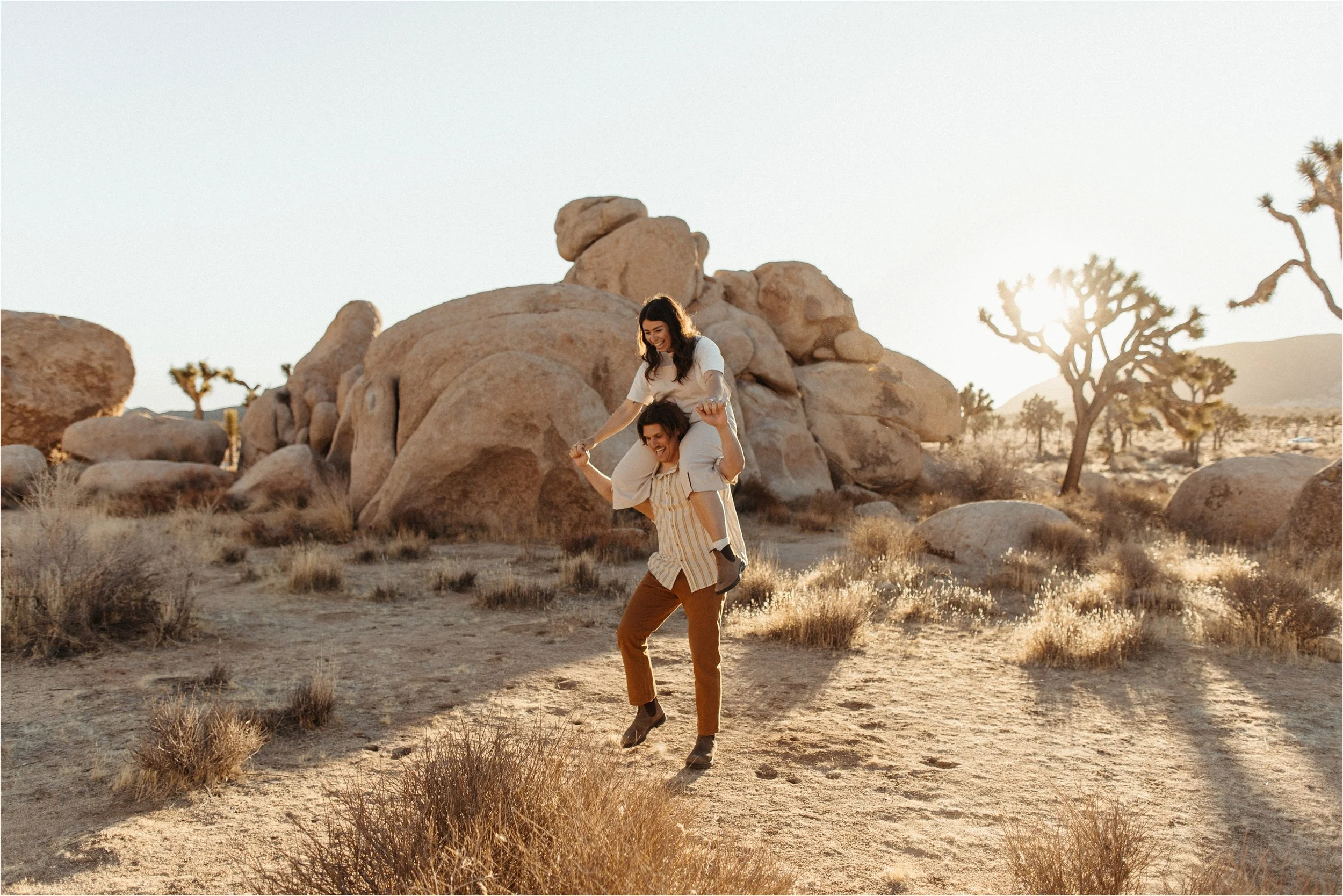 Golden Hour: The soft, golden light just after sunrise or before sunset is ideal for engagement photos. Joshua Tree’s desert landscape glows during golden hour, making your photos warm and magical.
